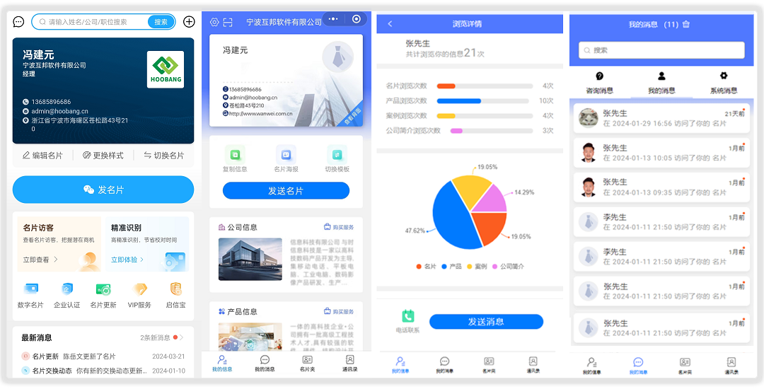 企業(yè)電子名片系統(tǒng)打通企業(yè)產(chǎn)品與微信生態(tài)圈實(shí)現(xiàn)內(nèi)外互通,拓寬公司產(chǎn)品的營銷渠道,提升公司知名度。